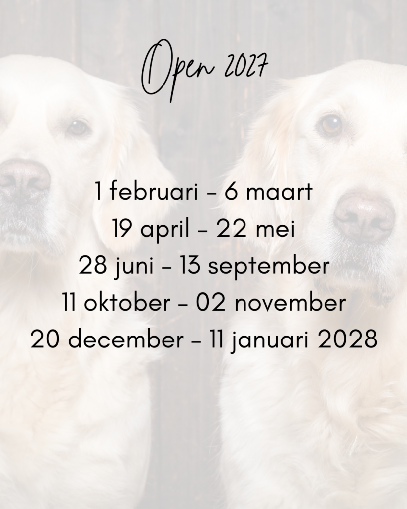 De data voor 2027 staan weer open in ons online reserveringssysteem. Wil je graag boeken? Doe dit dan door het formulier in te vullen. Ook voor 2027 geldt dat we als nieuwe klanten alleen nog de Golden Retriever aannemen.